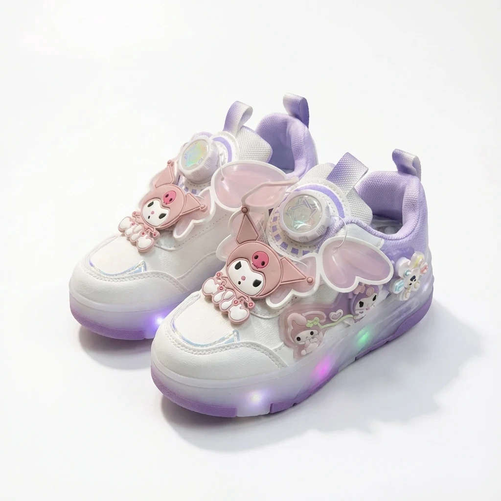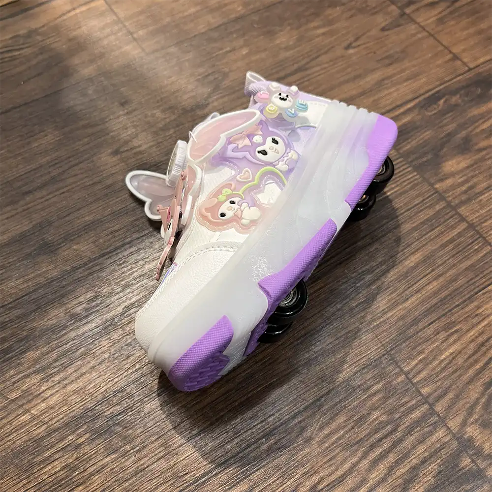 اگر به‌دنبال یک کتونی خاص، خوشرنگ و متفاوت برای دخترخانم‌های پرانرژی هستید، این کتونی چرخ‌دار سفید–بنفش طرح Kuromi یکی از جذاب‌ترین انتخاب‌هاست. طراحی پاستلی، بال‌های فانتزی و کاراکتر محبوب Sanrio باعث شده این مدل در نگاه اول دل هر بچه‌ای را ببرد.