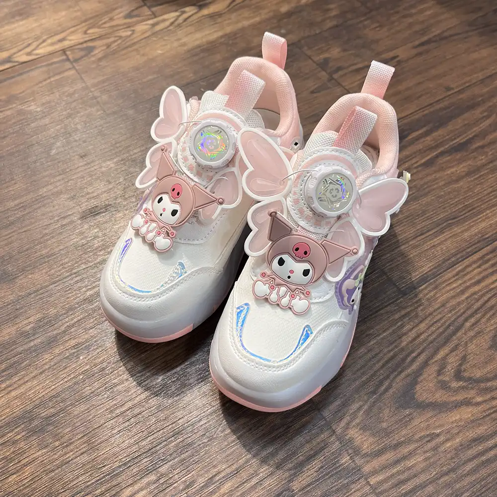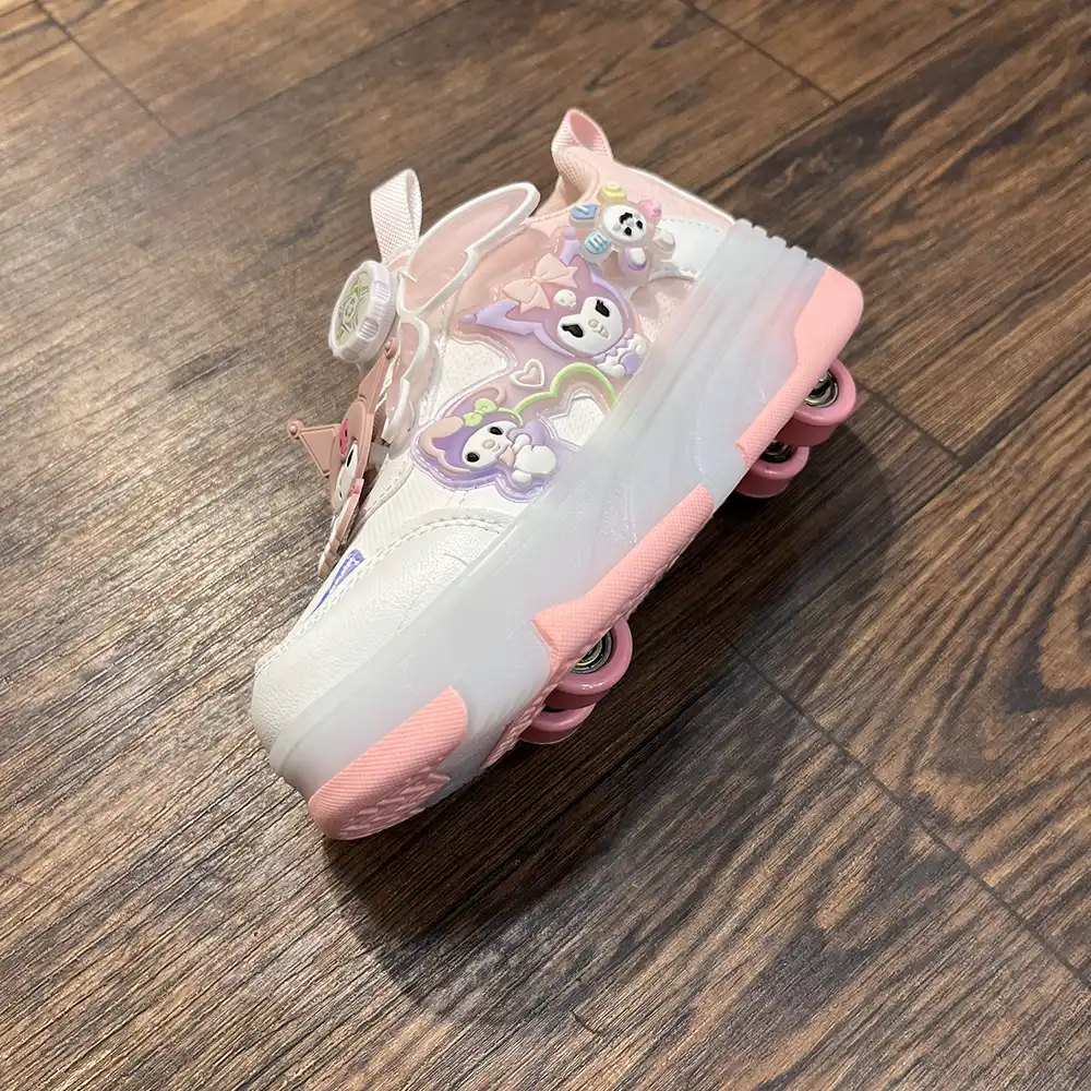 کتونی چرخ دار مدل فانتزی–کارتونی با تم صورتی و سفید؛ کاملاً مناسب استایلهای دخترانه، K‑fashion یا پوشیدن برای استایلهای playful است. طراحی آن از شخصیتهای Sanrio الهام گرفته (مشابه Kuromi و تمهای بالدار) است. طراحی مدرن با سیستم قفل چرخشی Dial Fit و چرخهای جداشونده، باعث میشود این کفش هم در حالت معمولی و هم در حالت اسکیتی عملکردی فوقالعاده داشته باشد. ظاهر صورتی سفید آن با نورهای LED درخشان، استایلی آیندهنگر و اسپرت برای کودکان ایجاد میکند.
