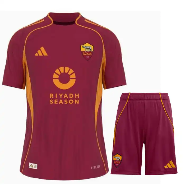 این کیت به ریشه‌های باشگاه وفادار است. رنگ زمینه زرشکی عمیق، با جزئیات طلایی رنگ در لوگوی آدیداس، نوارهای کناری و لوگوی اسپانسر، تضادی چشم‌نواز و باشکوه خلق کرده است. پنل‌های طلایی که از شانه‌ها تا کناره‌های پیراهن و شورت امتداد دارند، به لباس فرمی پویا و مدرن بخشیده‌اند. لوگوی تاریخی باشگاه رم (Lupetto) نیز به رنگ طلایی روی سینه می‌درخشد.