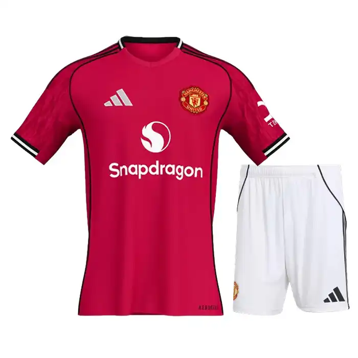 رنگ اصلی پیراهن، یک قرمز درخشان و پرانرژی است که نسبت به فصلهای گذشته، حس مدرنتری را القا میکند. این رنگ جذاب با جزئیات مشکی رنگ در سه خط معروف آدیداس روی شانهها، یقه گرد و نوارهای لبه آستین، ترکیبی کلاسیک و در عین حال پویا ایجاد کرده است. شورت سفید با نوارهای مشکی کناری، این ست را کامل کرده و به ظاهر سنتی و همیشگی منچستریونایتد وفادار مانده است.