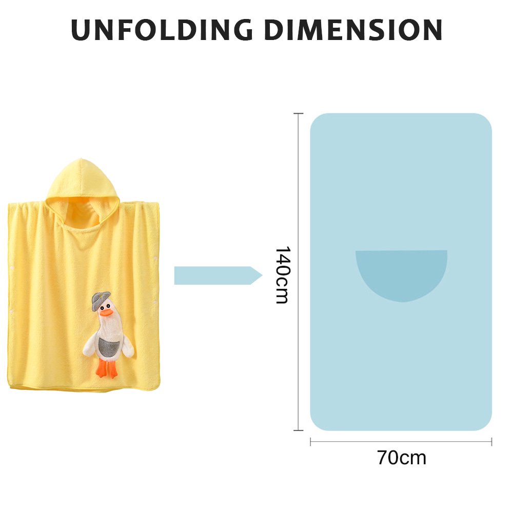 طراحی پانچویی کلاه‌دار باعث می‌شود سر و بدن کودک هم‌زمان خشک شود و به‌راحتی پوشیده شود. رنگ زرد شاد همراه با طرح کارتونی، این حوله را به گزینه‌ای جذاب برای کودکان تبدیل کرده است. این محصول برای استفاده در خانه، استخر، ساحل و سفر بسیار کاربردی است.