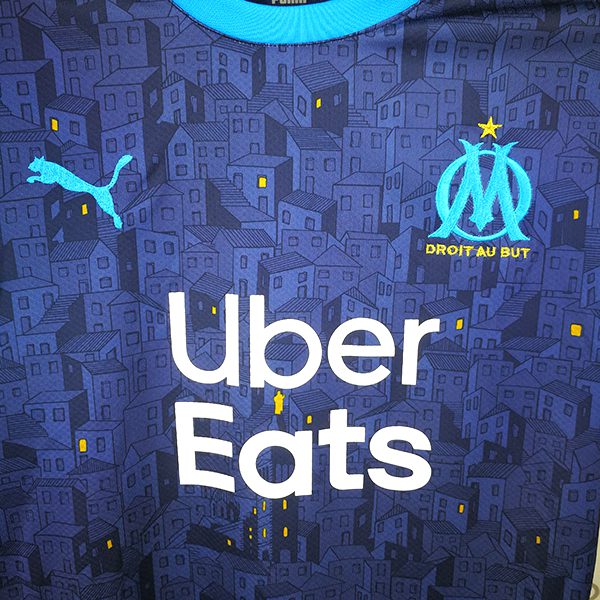 لباس دوم المپیک مارسی 2021 با رنگ سرمه ای و سرآستین و دور یقه آبی توسط کمپانی پوما ارائه شده است.پوما برای کیت خارج از خانه المپیک مارسی طرح گرافیکی خاص در نظر گرفته است که یک نمای منحصر به فرد از شهر مارسی است. این طرح گرافیکی یکی از خاص ترین طرح های این فصل لاشامپیونه است.