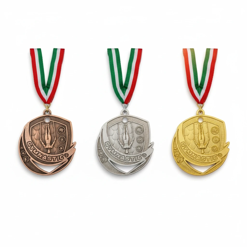 - پوشش تمام شاخهها: گرچه طرح مرکزی مربوط به دارحلقه است، اما وجود آیکونهای ریز در سمت راست (شامل خرک حلقه، موازنه و…) و نوشته بزرگ GYMNASTIC روی روبان پایین طرح، این مدال را برای تمام زیرشاخههای ژیمناستیک (هنری، ایروبیک، ترامپولین و…) قابل استفاده میکند.