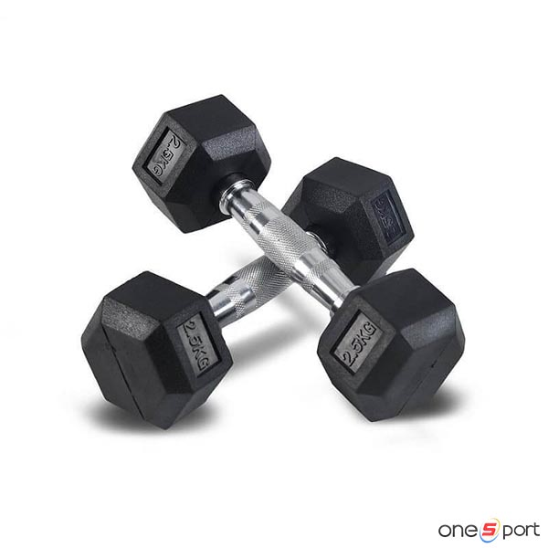 دمبل شش ضلعی 2.5 کیلوگرم در قسمت وزنه هایش دارای روکش لاستیکی می باشد که باعث می شود در اثر برخورد به دست و پای ورزشکاران کمترین آسیب ممکن را ایجاد کند. قطر میله‌ی وسط دمبل که باید از این محل در دست گرفته شود 30 میلی‌متر است و به‌ صورت دوتایی عرضه ‌می‌شود که قابلیت اضافه کردن وزن را ندارد.