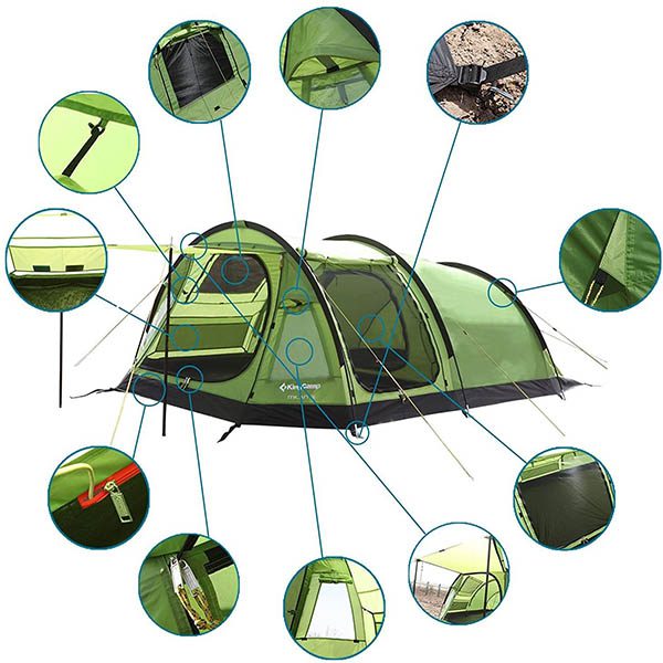 به کمک چادر کینگ کمپ مدل KT3056 ( نام دیگر چادر کینگ کمپ مدل Milan3 ) در یک فضای اضافی کاملاً محصور، می توانید با دوستان یا خانواده با هم غذا بخورید یا تجهیزات خود را در یک انبار از باران دور نگه دارید. همچنین برای اطمینان از عدم وجود خاک یا آب در چادر و محافظت بیشتر در برابر باد بهترین انتخاب ممکن است. این چادر پلی استر با روکش PU و پایه PE Wannenartige و از پارچه آکسفورد 210D در برابر نفوذ آب محافظت می کند. 2 در بزرگ (1 ورودی اصلی و یک درب فرعی) ، با استفاده از میله های قفل کننده برای سایبان، دو پنجره PVC با شبکه Polyesterabdeckung برای لذت بردن از آفتاب و چشم انداز و تهویه عالی این چادر را به انتخاب عالی برای کمپینگ های خانوادگی تبدیل کرده است.