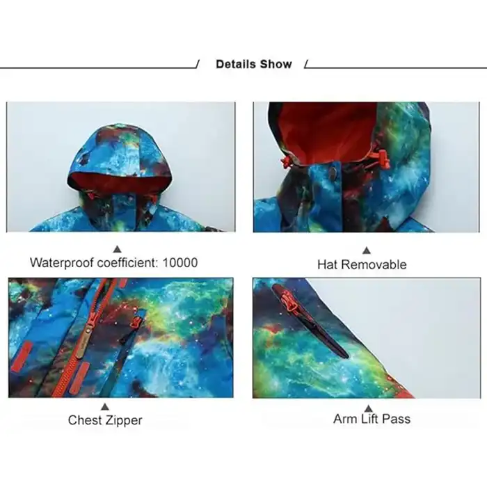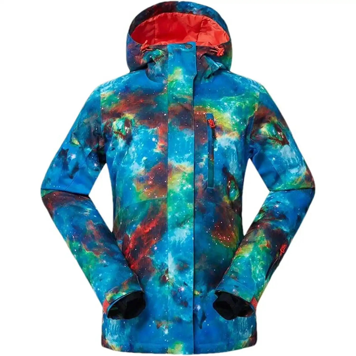 کاپشن اسکی زنانه GSOU SNOW مدل JK1798 با طرح کهکشانی و کلاه قرمز داخلی، ضدآب و ضدباد مناسب اسکی و اسنوبرد زمستانی.