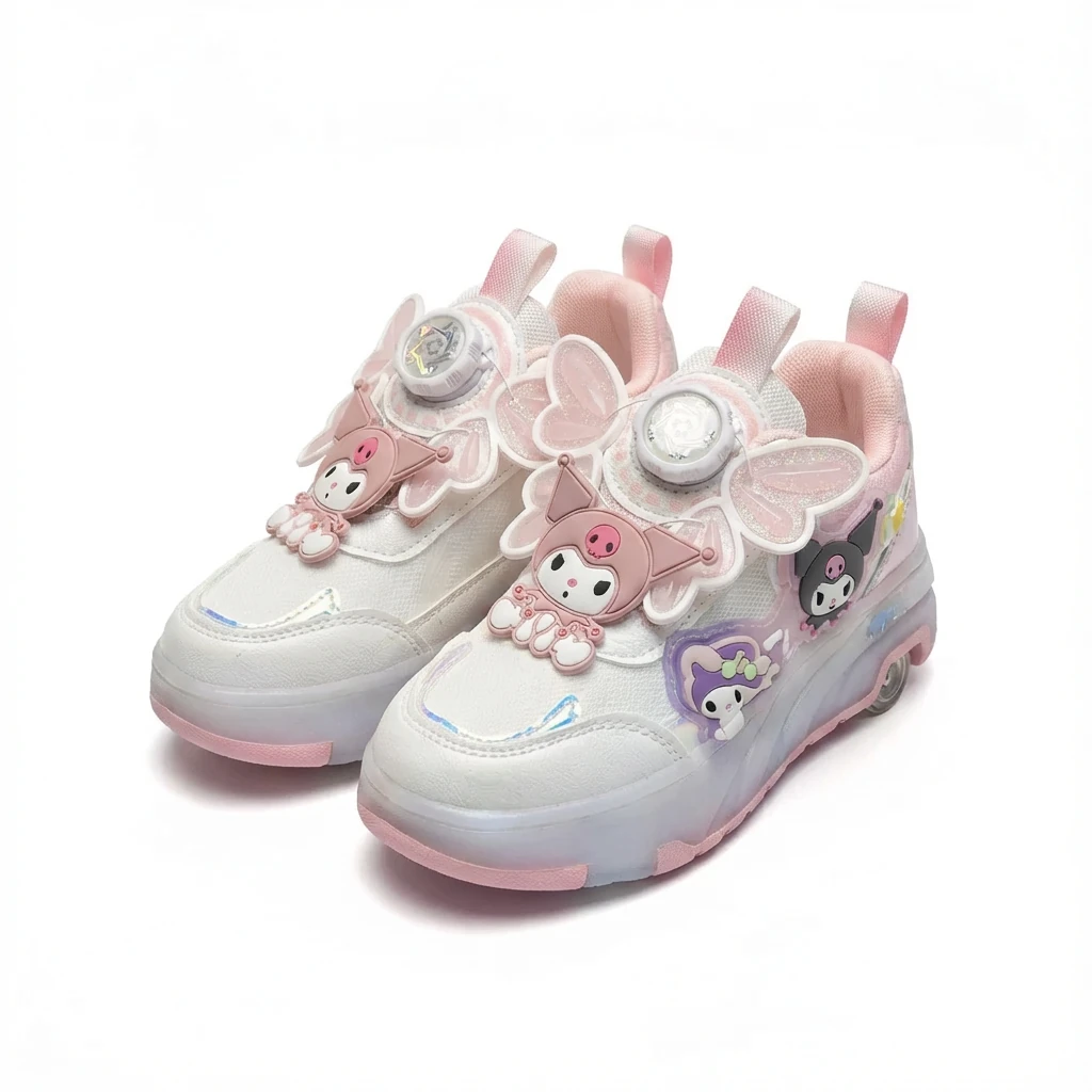 کتونی چرخ دار مدل فانتزی–کارتونی با تم صورتی و سفید؛ کاملاً مناسب استایلهای دخترانه، K‑fashion یا پوشیدن برای استایلهای playful است. طراحی آن از شخصیتهای Sanrio الهام گرفته (مشابه Kuromi و تمهای بالدار) است. طراحی مدرن با سیستم قفل چرخشی Dial Fit و چرخهای جداشونده، باعث میشود این کفش هم در حالت معمولی و هم در حالت اسکیتی عملکردی فوقالعاده داشته باشد. ظاهر صورتی سفید آن با نورهای LED درخشان، استایلی آیندهنگر و اسپرت برای کودکان ایجاد میکند.