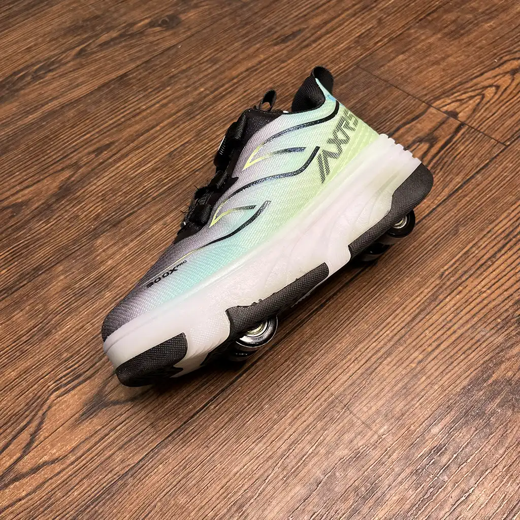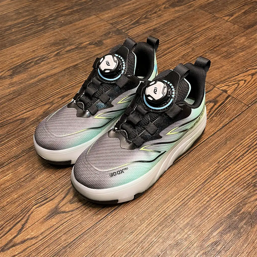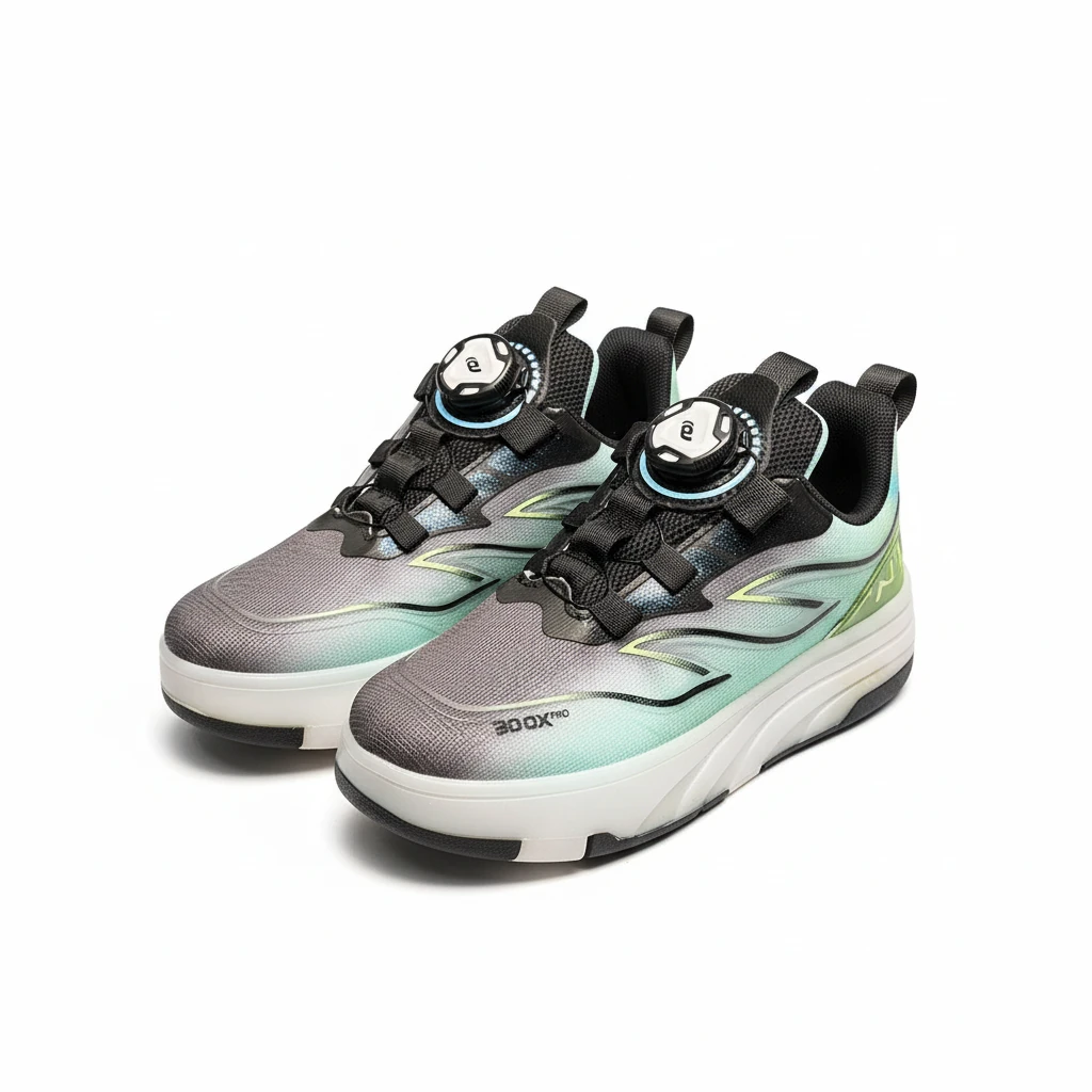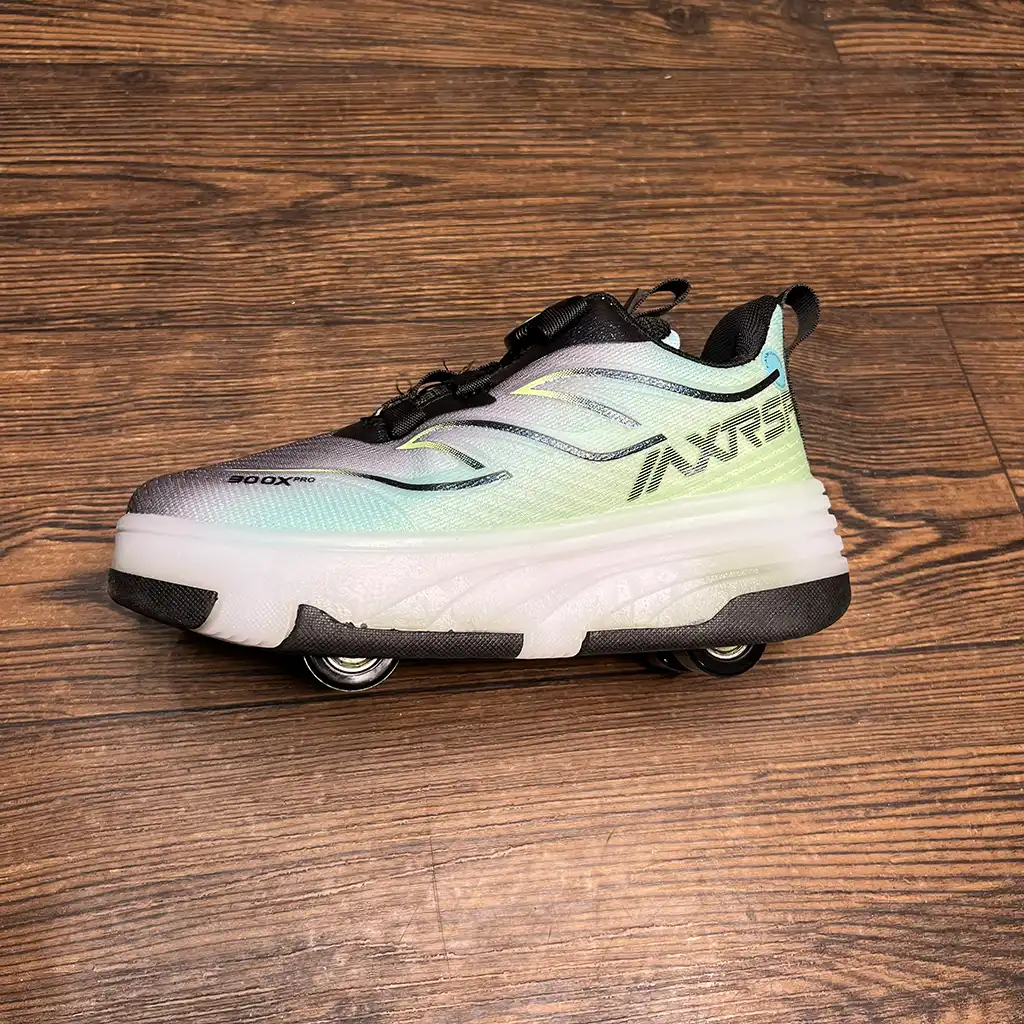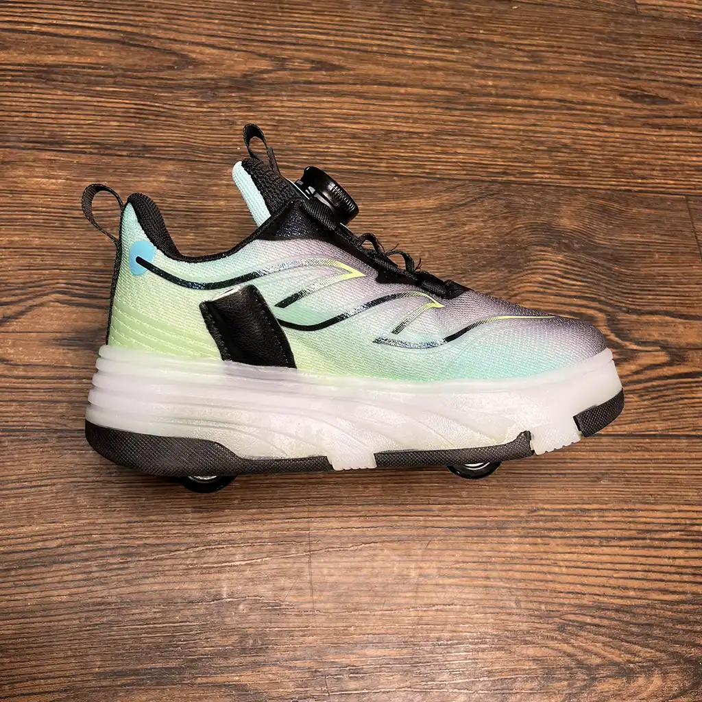 طراحی دینامیک با طیف سبز ملایم در کنار مشکی، این مدل را هم مدرن و هم اسپرت کرده است. فناوری دوحالته باعث میشود کودک بتواند سریع بین حالت اسکیتی و کفش معمولی جابجا شود، بدون اینکه ظاهر کفش تغییر زیادی کند.