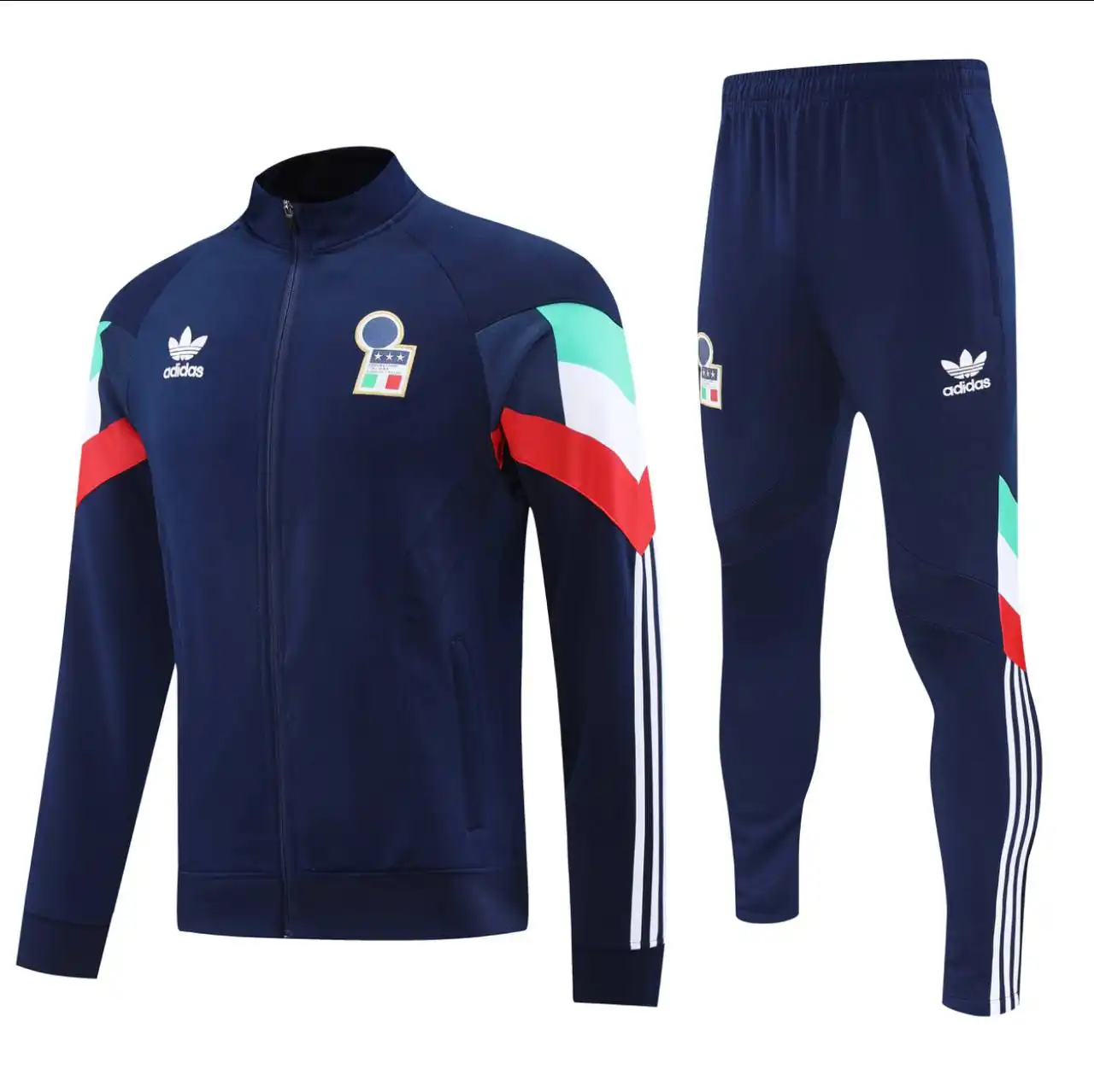 اگر به دنبال لباسی هستید که هم عشق شما به “آتزوری” (تیم ملی ایتالیا) را نشان دهد و هم یک آیتم شیک برای استایل‌های خیابانی (Streetwear) باشد، این ست بهترین انتخاب است. این گرمکن شلوار از سری محبوب Adidas Originals است که با لوگوی نوستالژیک “شبدر” (Trefoil) شناخته می‌شود. برخلاف کیت‌های آبی روشن همیشگی، این ست با رنگ زمینه سرمه‌ای سنگین و جذاب طراحی شده که قابلیت ست شدن بالایی دارد.